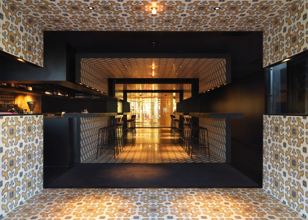 The exterior of the restaurant only partially hints at complexity of the interiors. The project divides the vast central dining space into small pods delimited by square steel profiles finished in handmade Sicilian ceramic tiles. Normally used for exteriors, the tiles are decontextualized, running along the floor, walls and ceiling of the tasting areas. These brightly coloured surfaces fold and wrap around the restaurant’s guests.