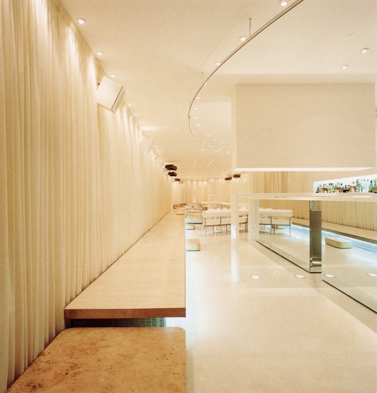 A bar-restaurant is not only a functional space, but also the environment of a shared social experience, of a ritual marked by a certain degree of theatricality. Beginning with this supposition, Nil was designed as a blank page to be interpreted and modified. The project focused on maximum flexibility to generate a mise-en-scène that responds to individual events. White drapes divide and connect a space that can be easily, quickly and remotely transformed. When closed they compose two ovals, one for the bar and one for the dining room/privée. More than simple spatial diaphragms, they also serve as screens for the projection of lights, colours and video images used to connote a constantly different space. This device also allows for the transformation of the space into an exhibition hall for video art.