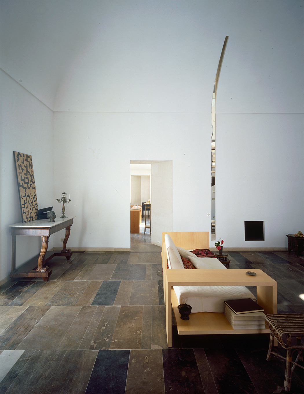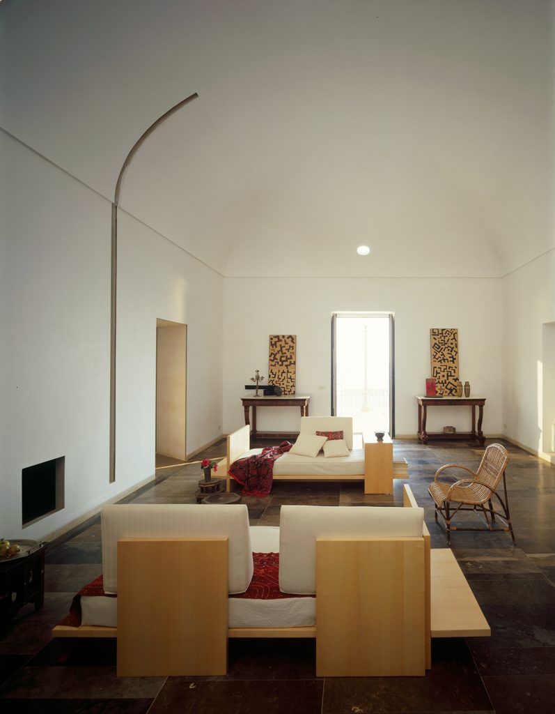 Animated by a contemporary art collection, the furnishings are mixture of historic family heirlooms and pieces designed by the office, such as the Dormusa beds and sofas, the Serventi tables, the Sotto e Sopra table and Bsedia chair, and the Tric-Trac library, each transformable to adapt to different situations.