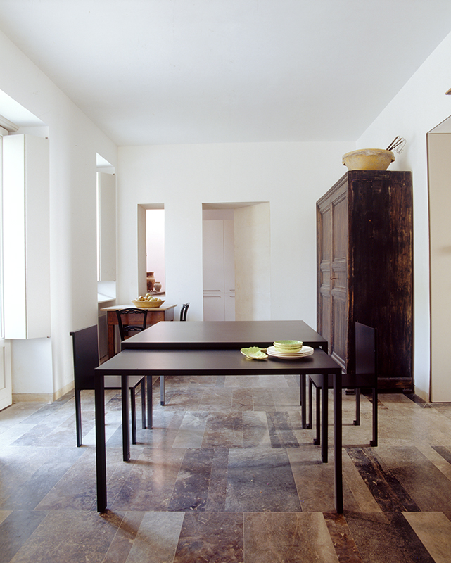 The restoration employs the ‘poor’ materials typical of the area, such as the soft limestone of Scicli, cut and worked by maestri d’ascia (stone carpenters), and pece, a typical asphalted sandstone that had fallen into disuse until it was rediscovered by the office. This material was used for all the paving and the surface beneath the washbasin in the bathroom. The result is a heterogeneous and vibrant pattern, rich with chromatic variations that move from beige to pink to brown.